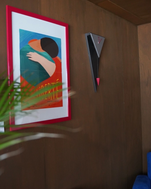 1980's Made in West Germany Buying in Berlin , Germany W25 H53 D6.5 (cm) 電池式(単三電池) . Hermle...ドイツの時計/ムーブメントメーカー。 ドイツの黒い森(シュヴァルツヴァルト)地方の時計産業圏に根ざしたメーカーで、長年にわたり時計/ムーブメントを供給してきました。 そんなHermeが特に得意とする、振子時計。 幾何学的なデザインと、黒と赤のはっきりした色合いは、80年代の製品に典型的なポストモダンデザインです。 裏側にW.Germanyという表記があることから、ドイツ統一前の西ドイツ製ということがわかります。 壁掛け時計兼アートという立ち位置で、写真のように他のアートと並べて掛けても、馴染みます。 もちろん単体でも存在感があり素敵。 電池式なので、メンテナンスも簡単です。 . 経年相応の小傷、スレあり