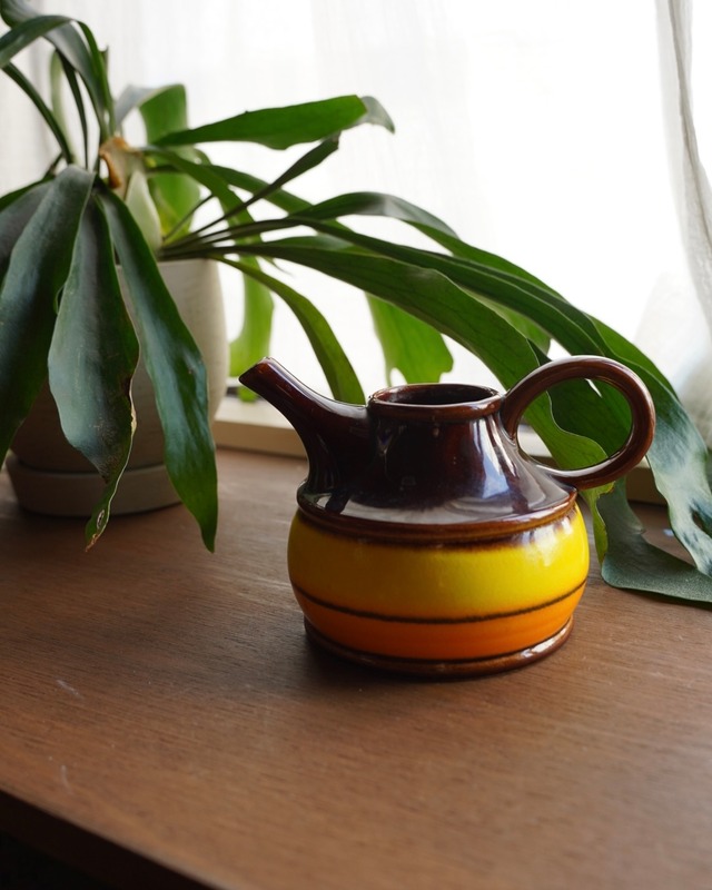 Scheurich...Fat Lavaを代表する、ドイツのブランド。 花瓶や鉢カバーを多く手がけていました。 ブラウンの釉肌と流れるような模様が渋い雰囲気。 写真では色味の少ないアンスリウムと合わせていますが、カラフルなお花との合わせもきっと素敵なはずです。 1960's-1970's Made in FGR (西ドイツ) Buying in Berlin , Germany Ceramic Φ10 / 注ぎ口Φ6 / 底Φ6.3 / H19 (cm) ヒビ・欠けなし 使用に影響するダメージなし