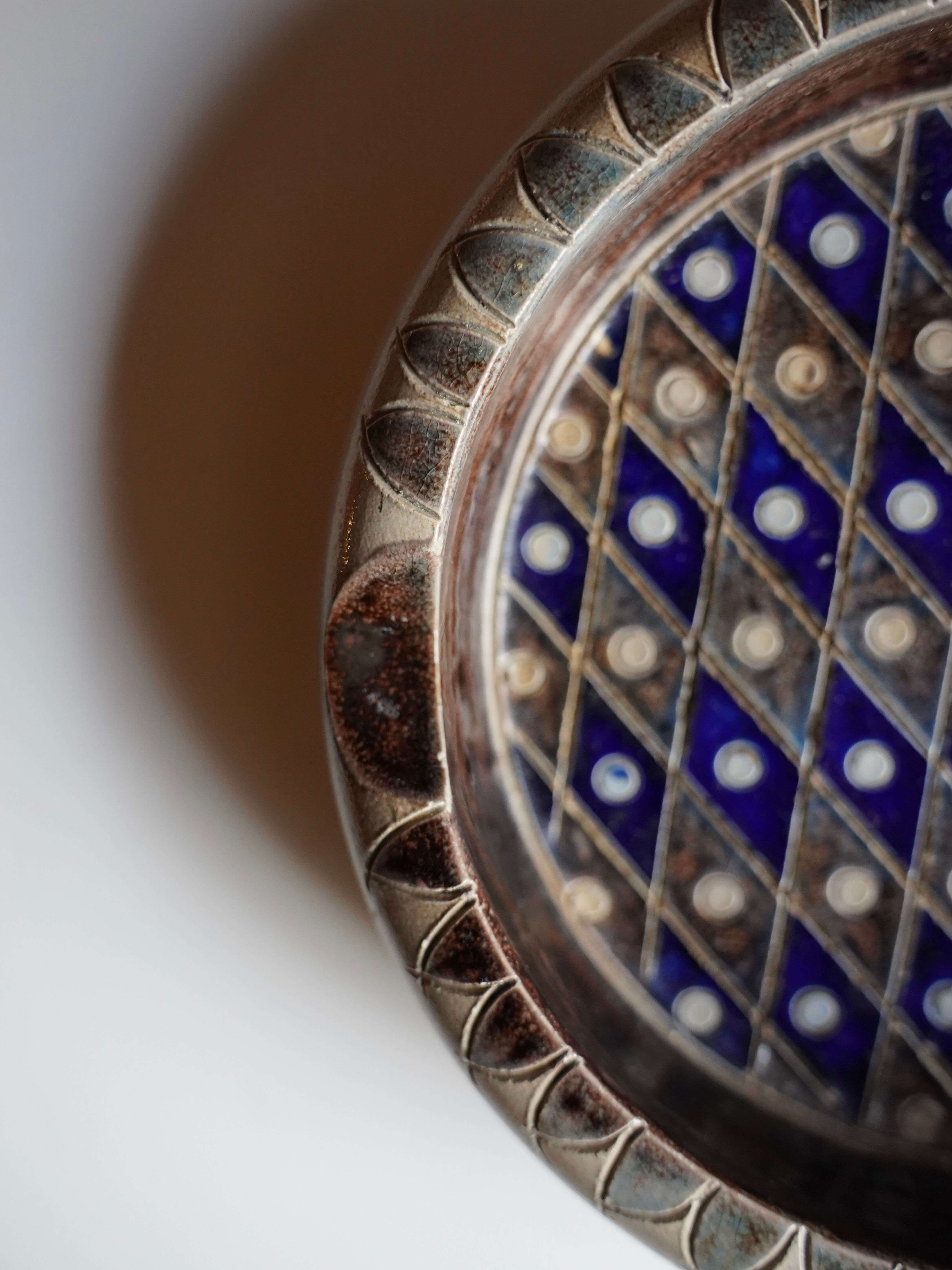 深いコバルトブルーと、葉模様の縁飾りが映える一品。