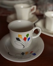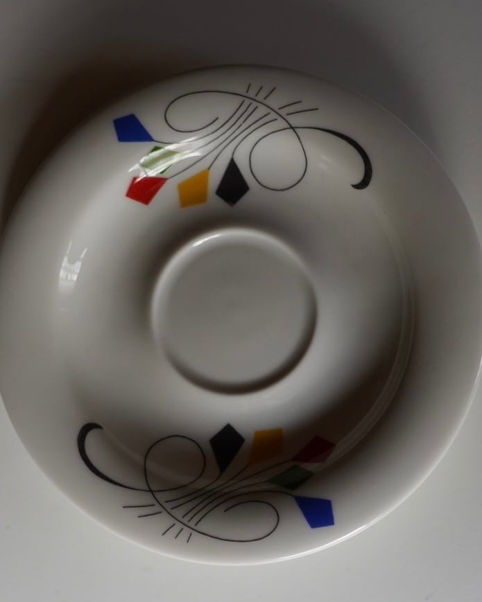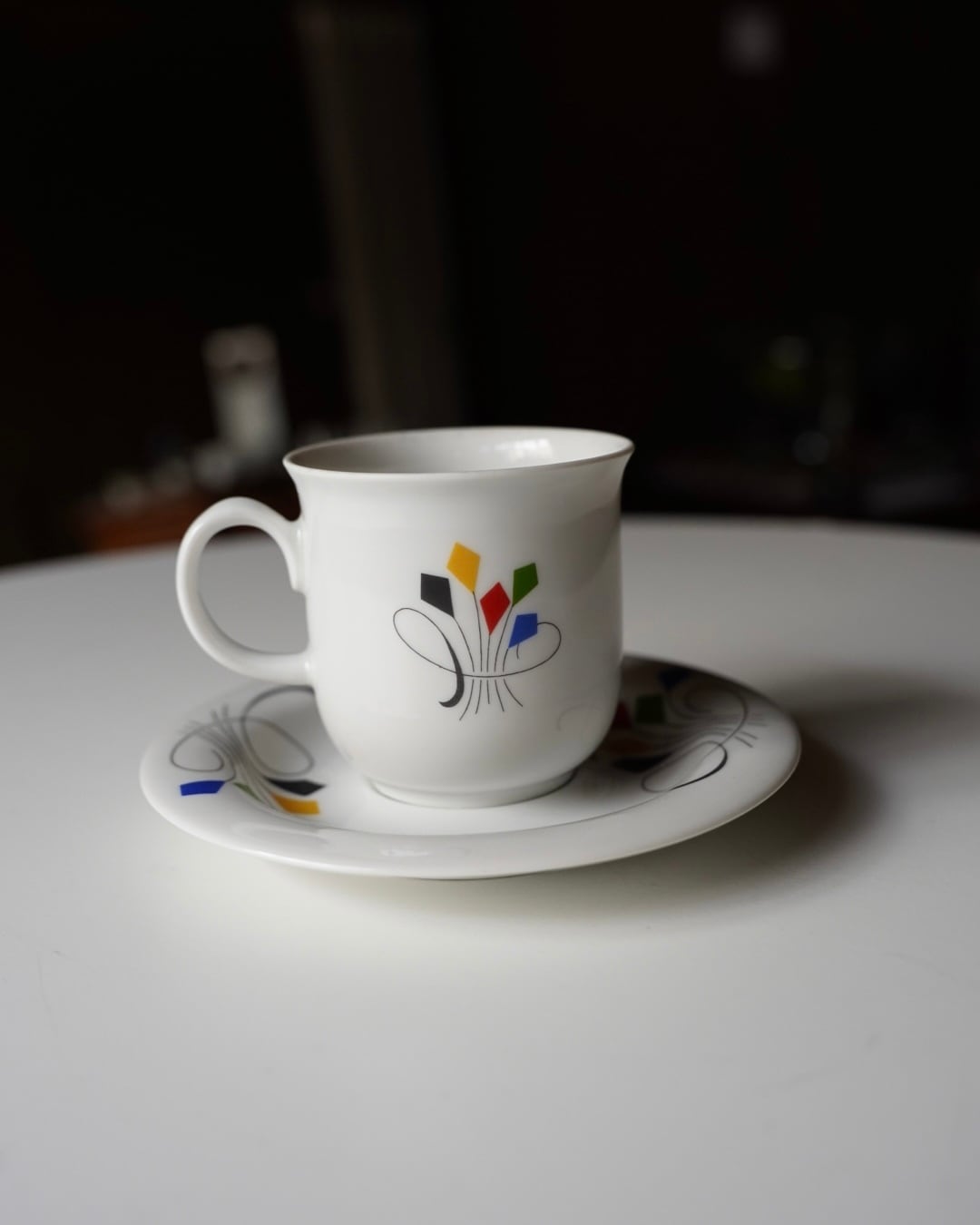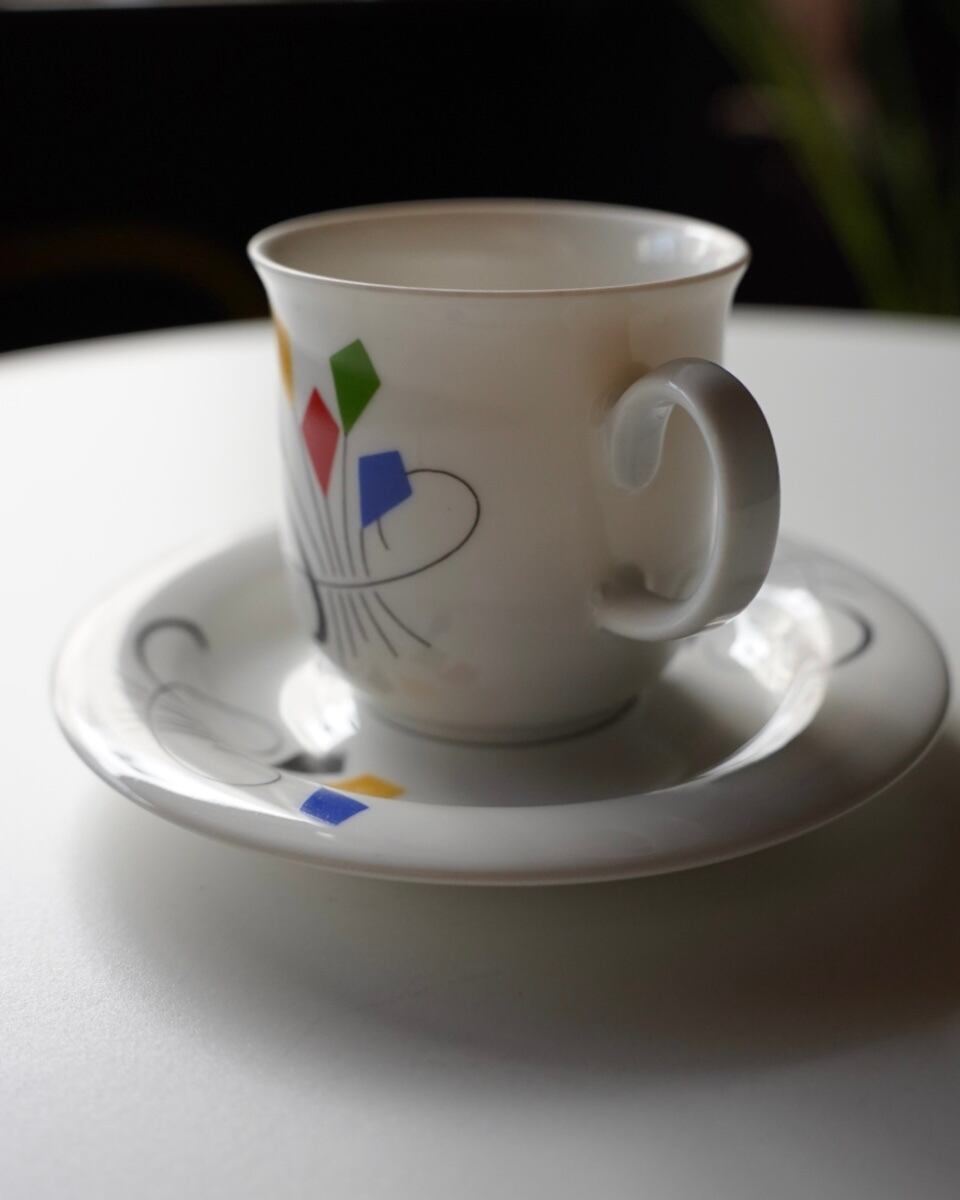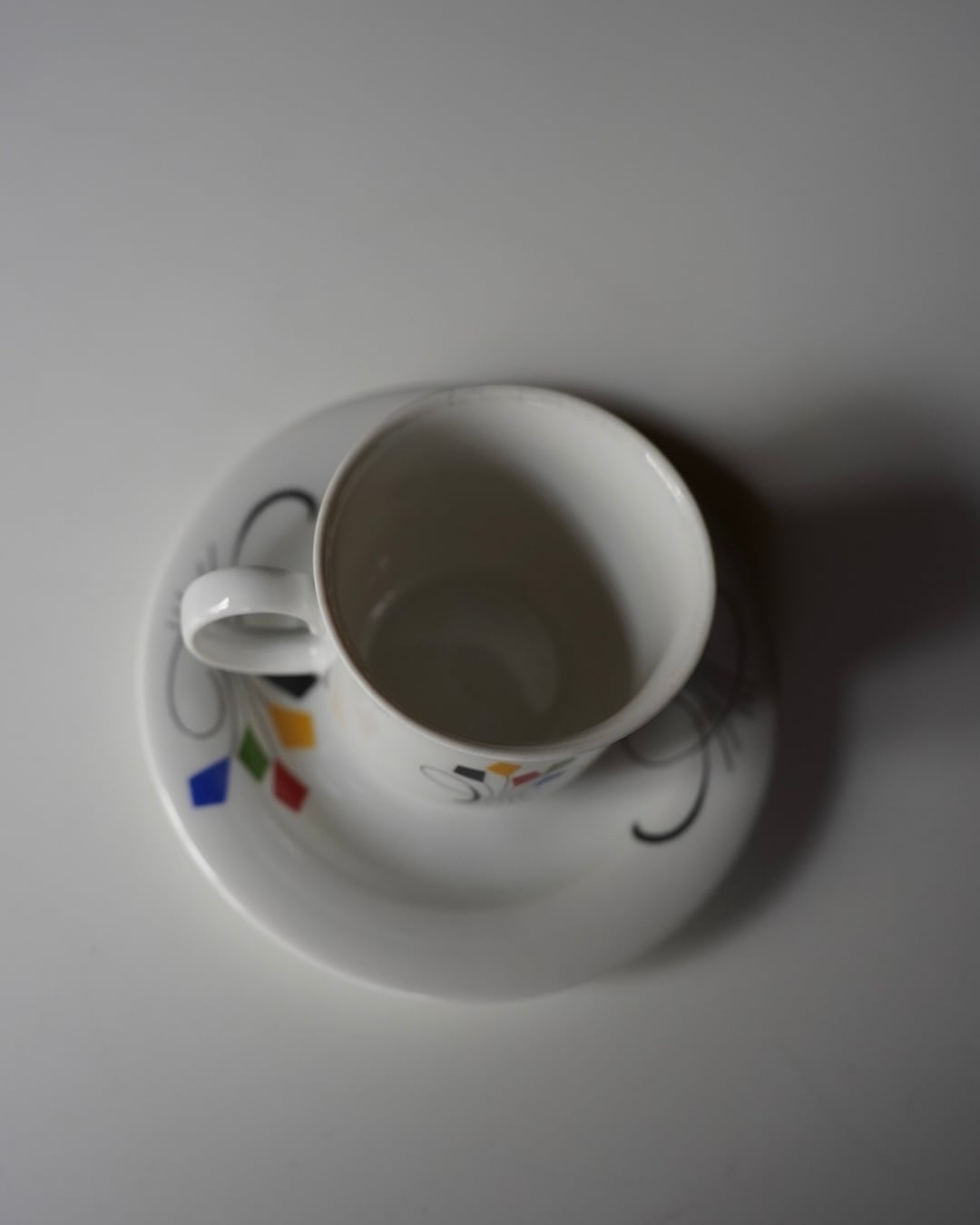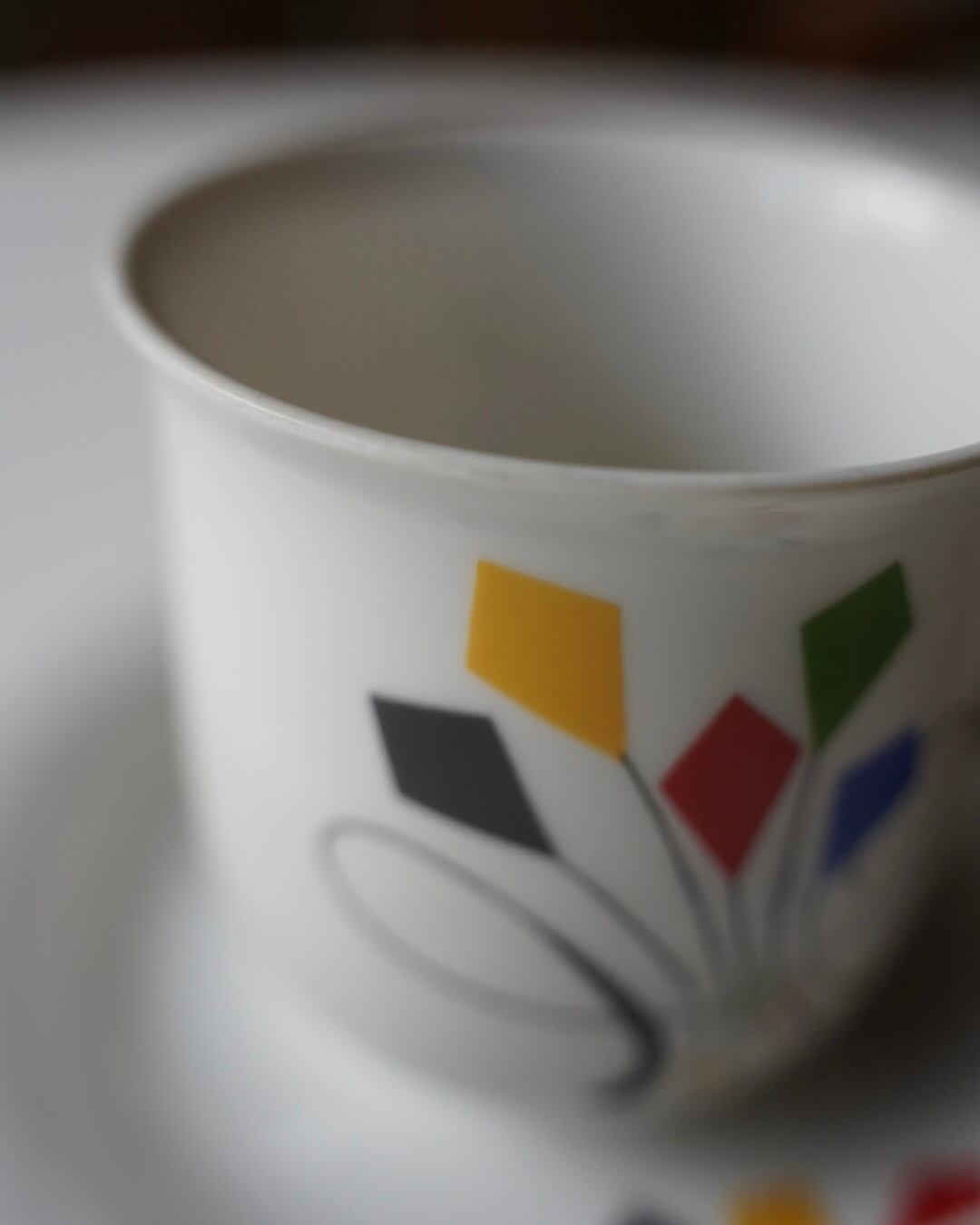 どこかクラシカルな雰囲気の漂うカップアンドソーサーのデザインは、モダンアート風の幾何学模様と色合いが、ザ・ミッドセンチュリーモダンな印象です。