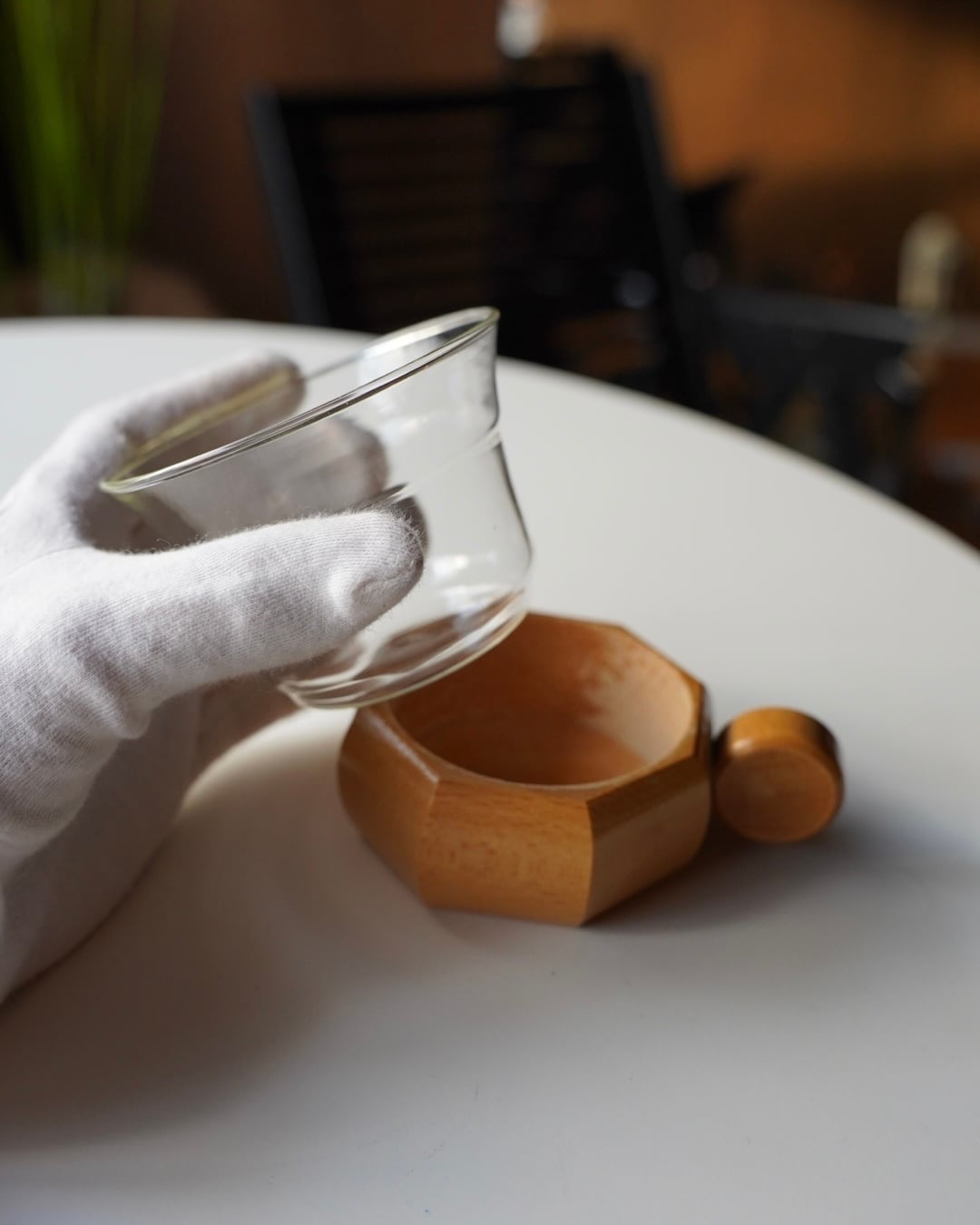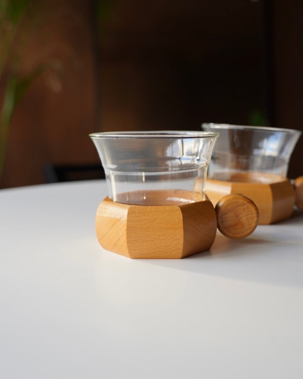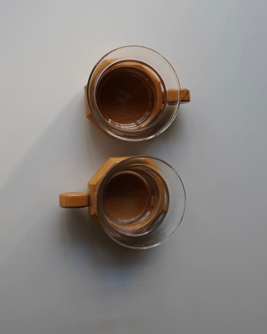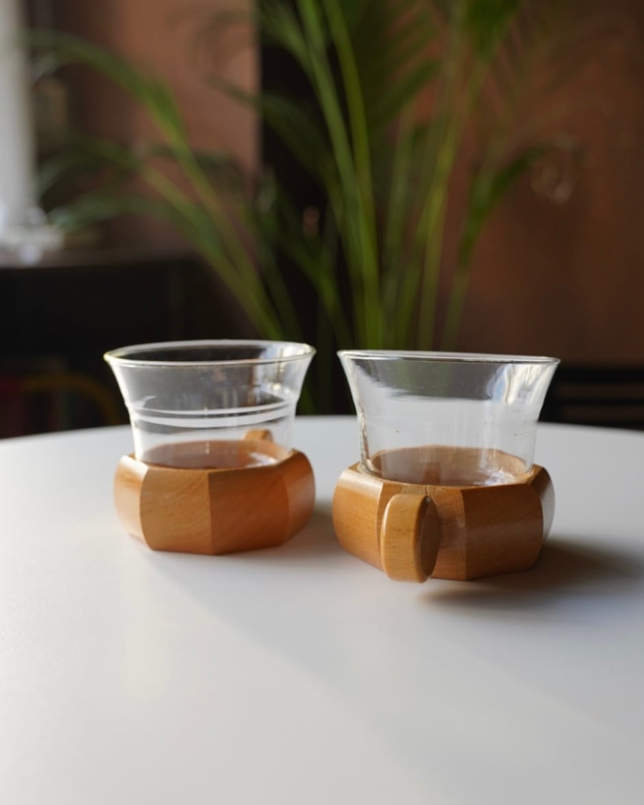 木の持ち手が取り外しできる仕様のガラスカップ。