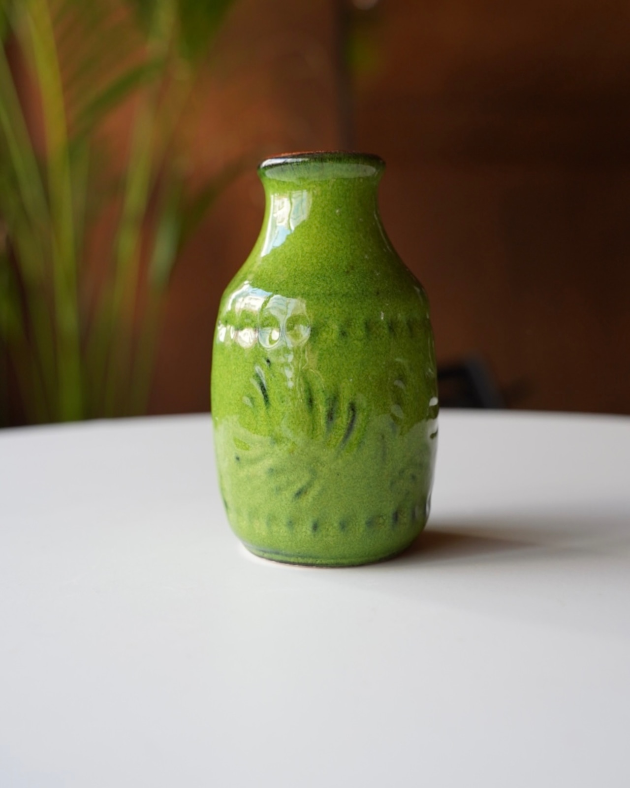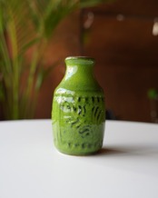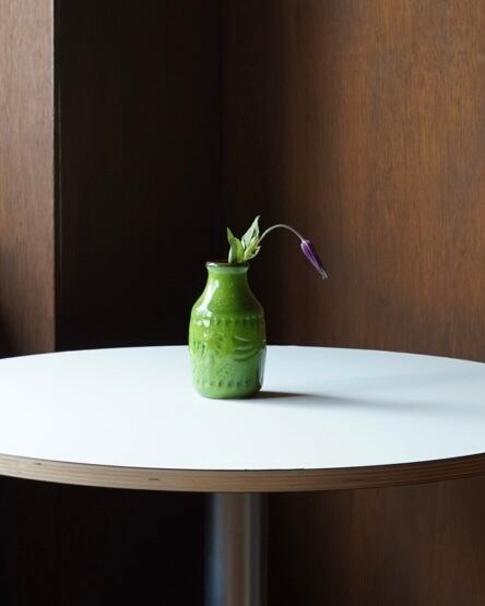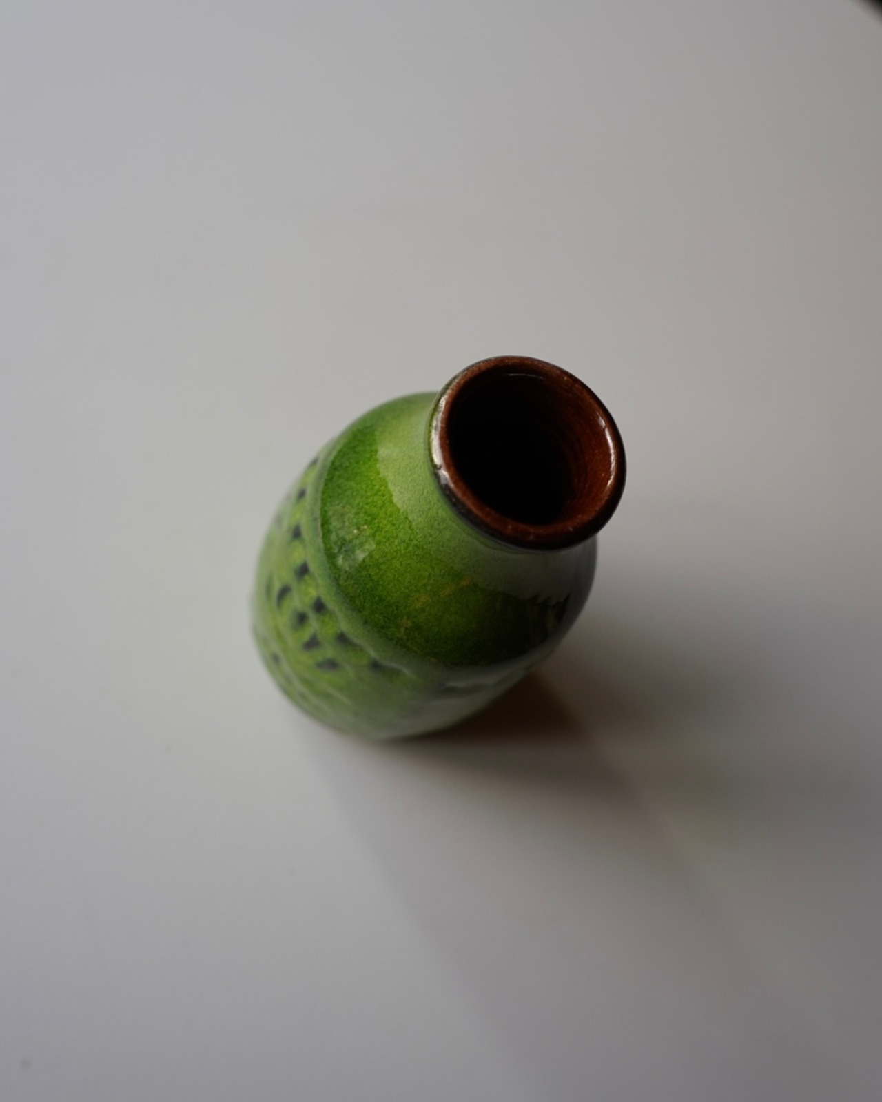明るい青リンゴのようなカラーの釉薬が特徴的な花器。