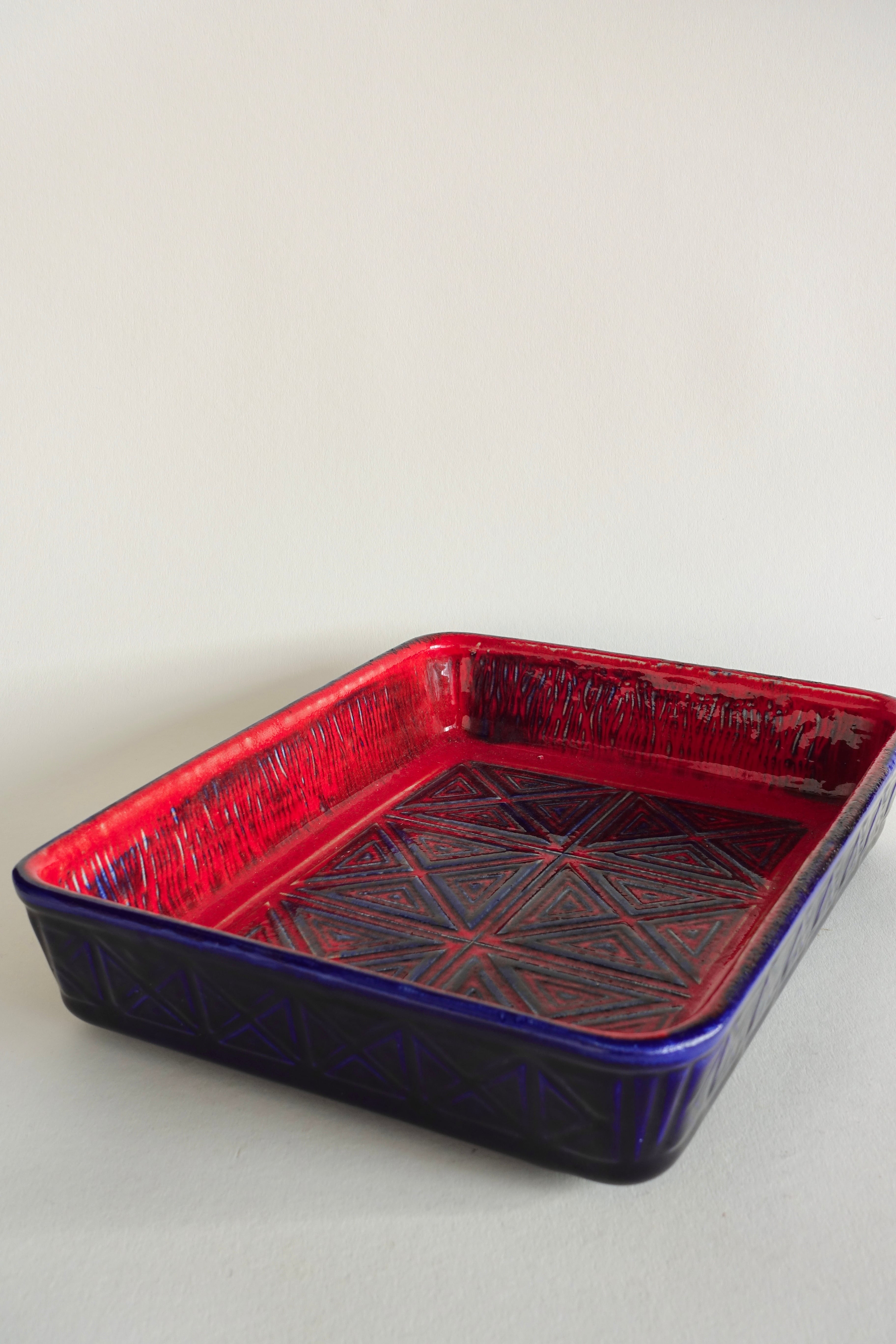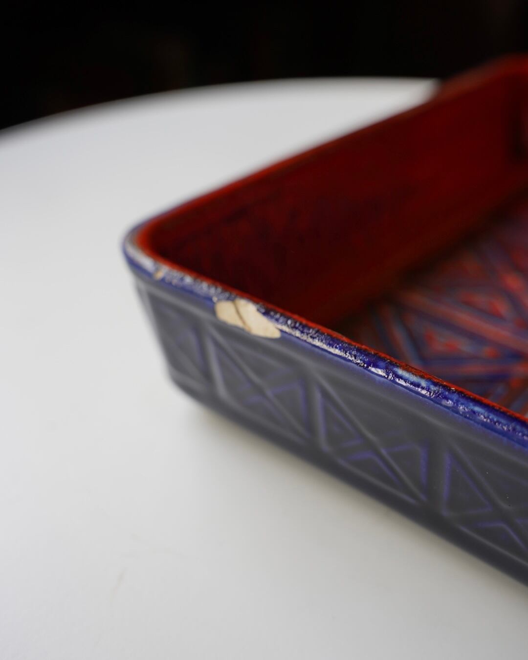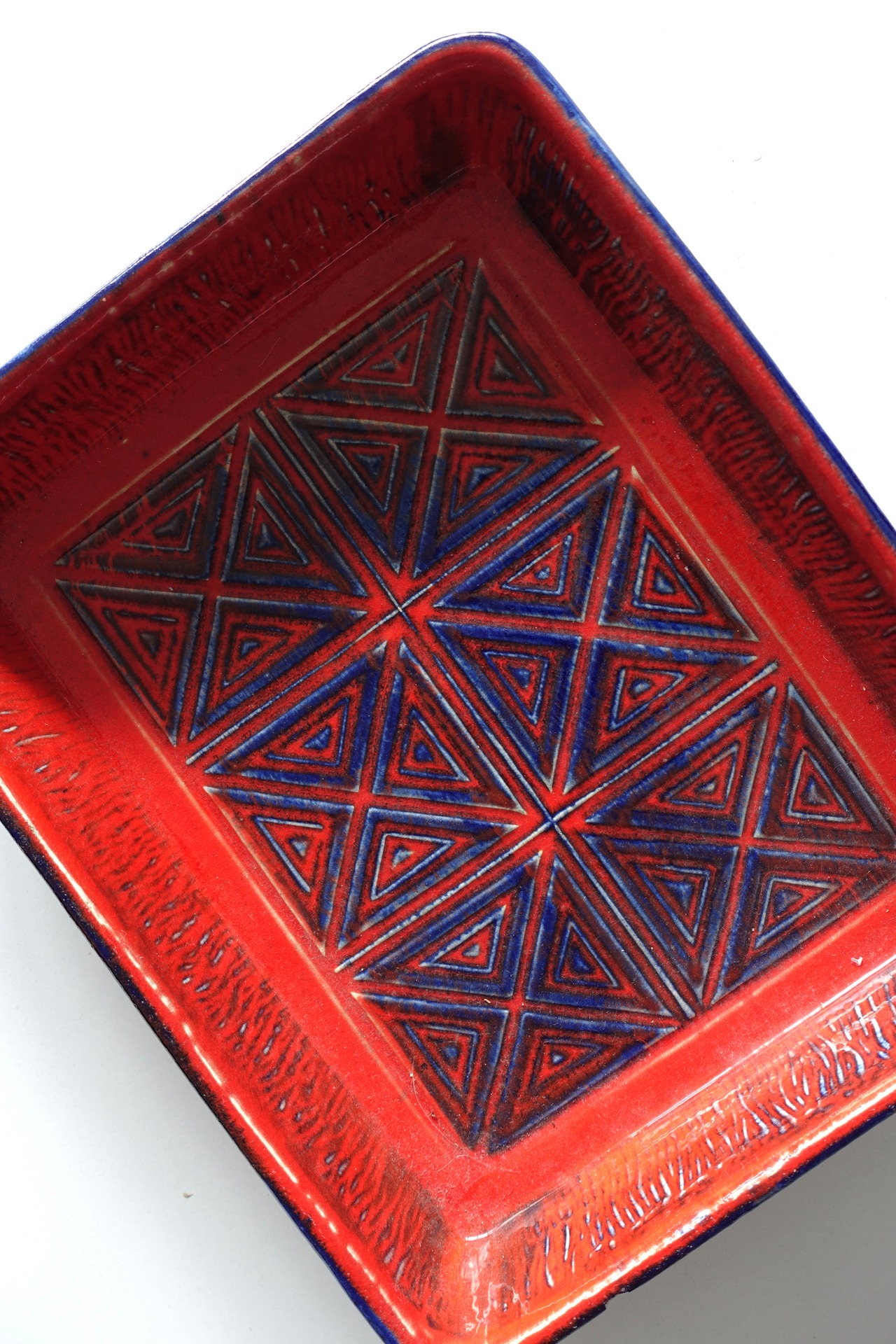 釉薬の厚み、幾何学模様の型押し、赤とコバルトブルーの独特な発色が