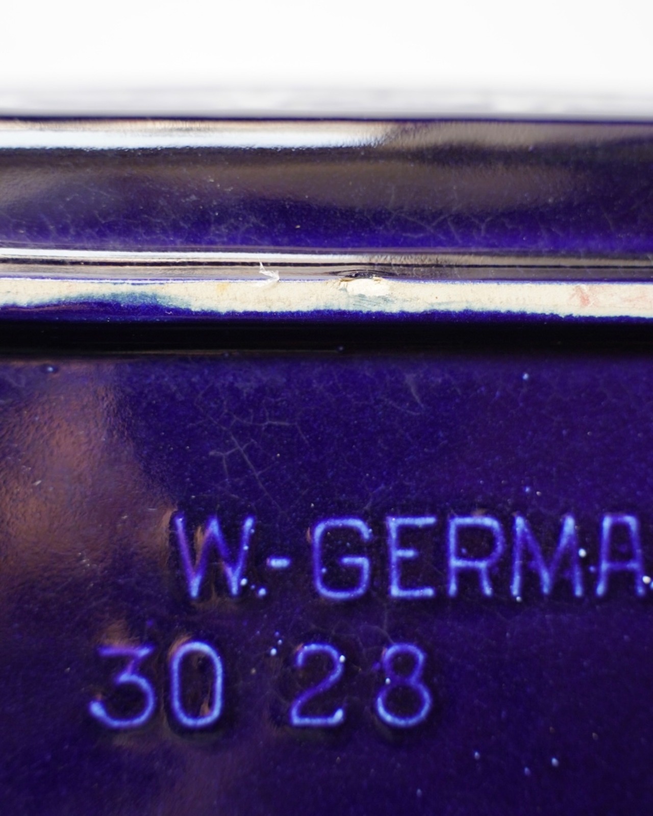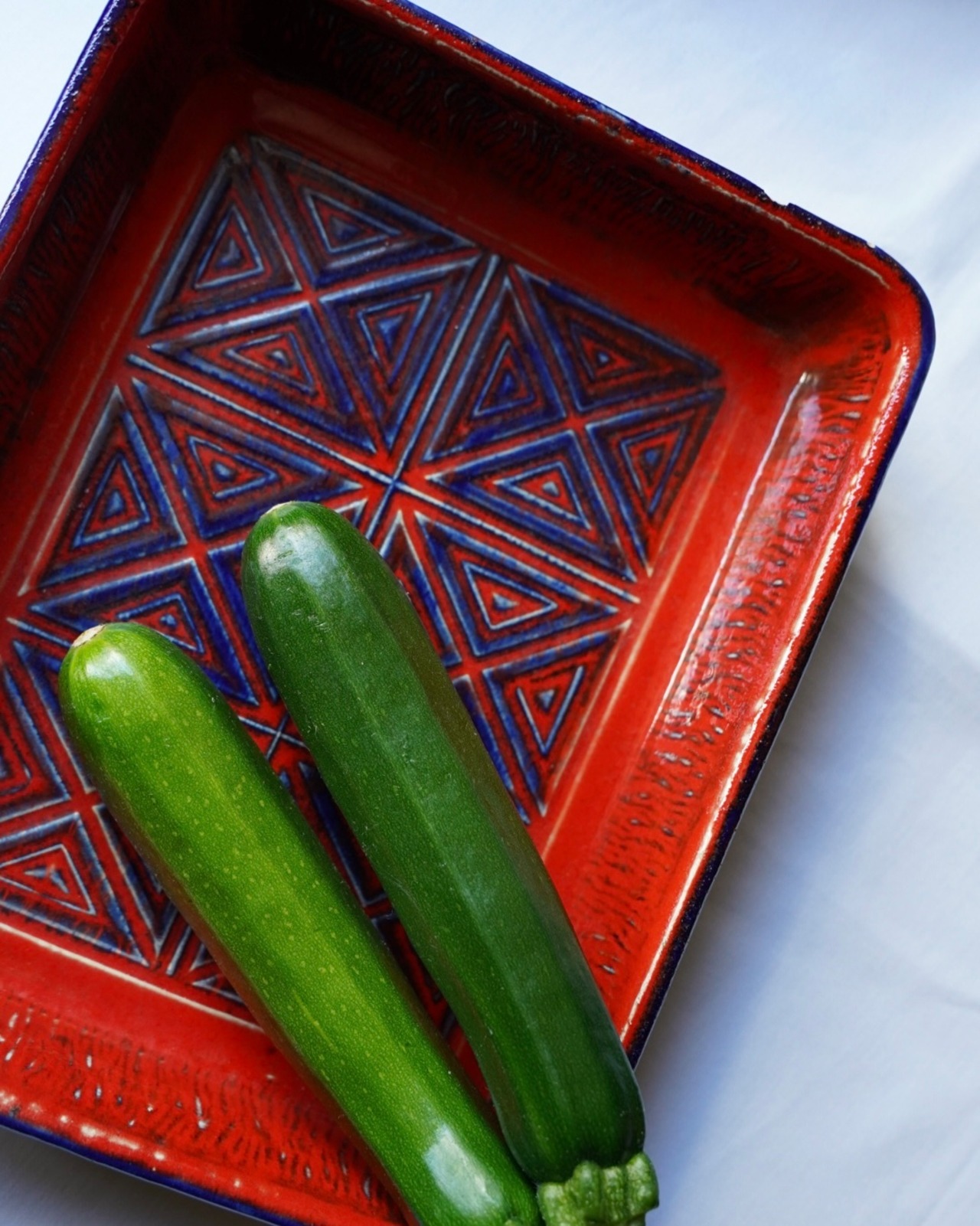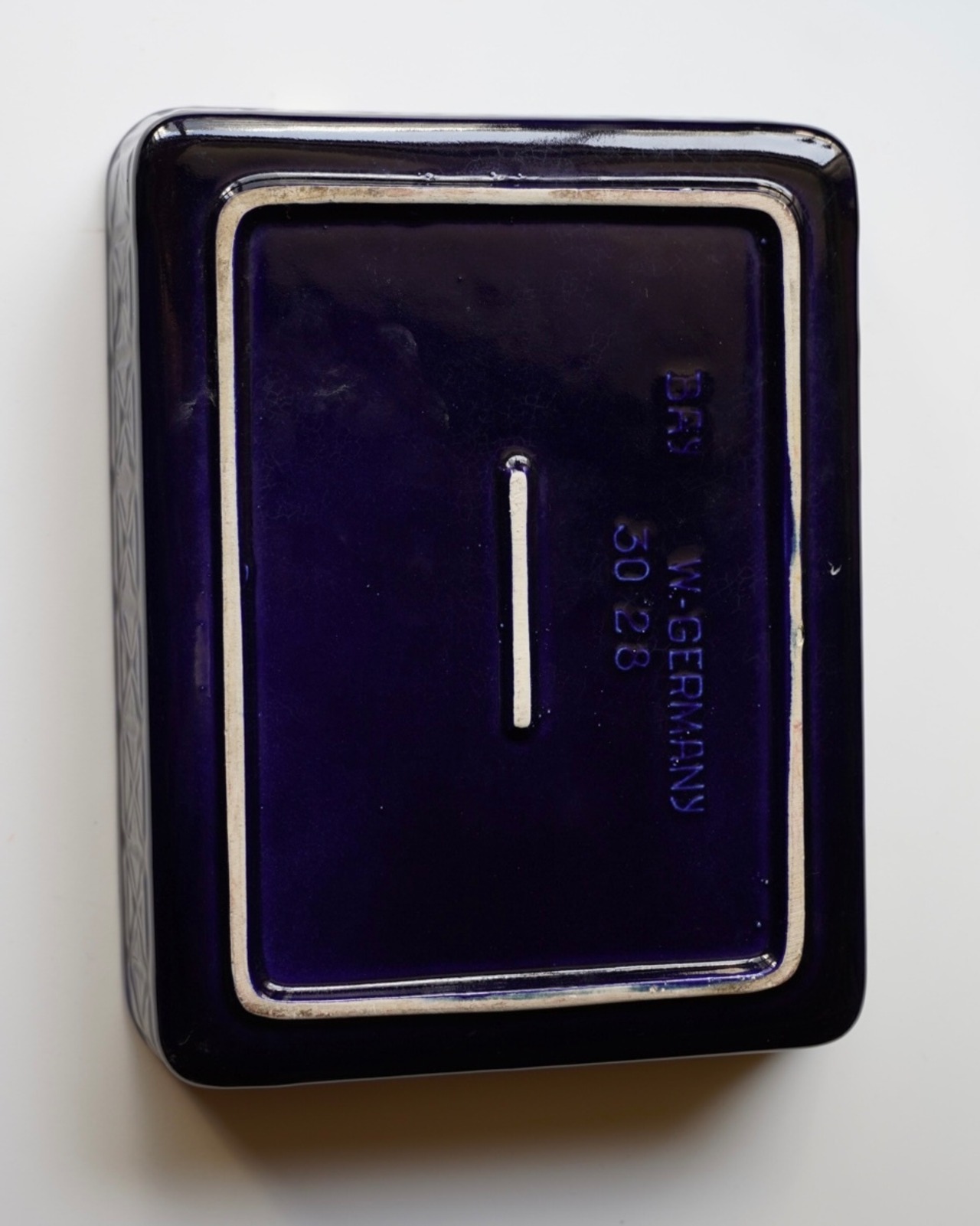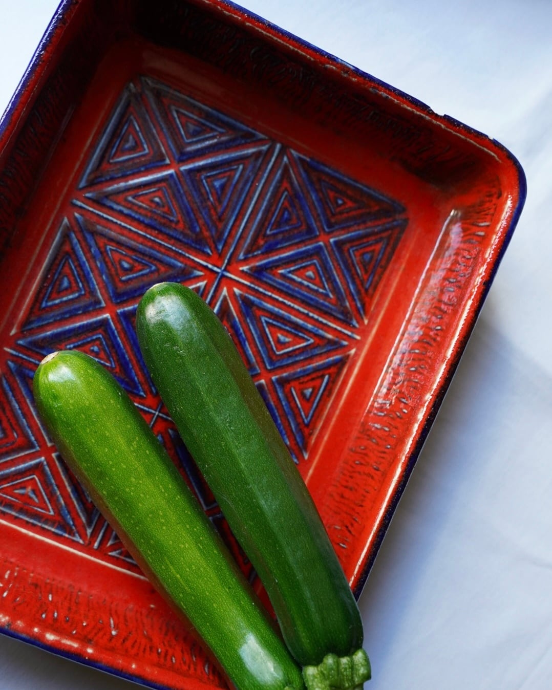 釉薬の厚み、幾何学模様の型押し、赤とコバルトブルーの独特な発色が