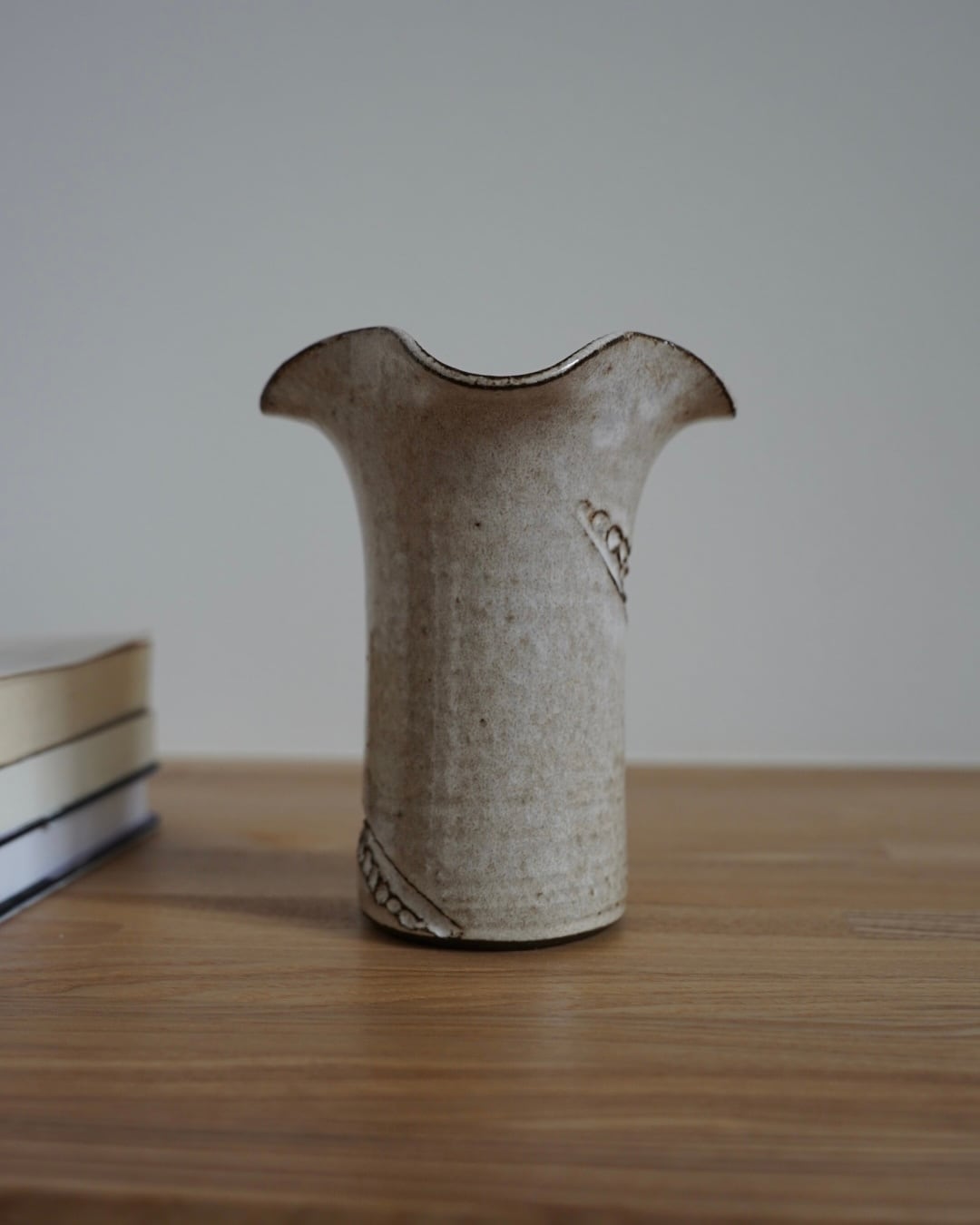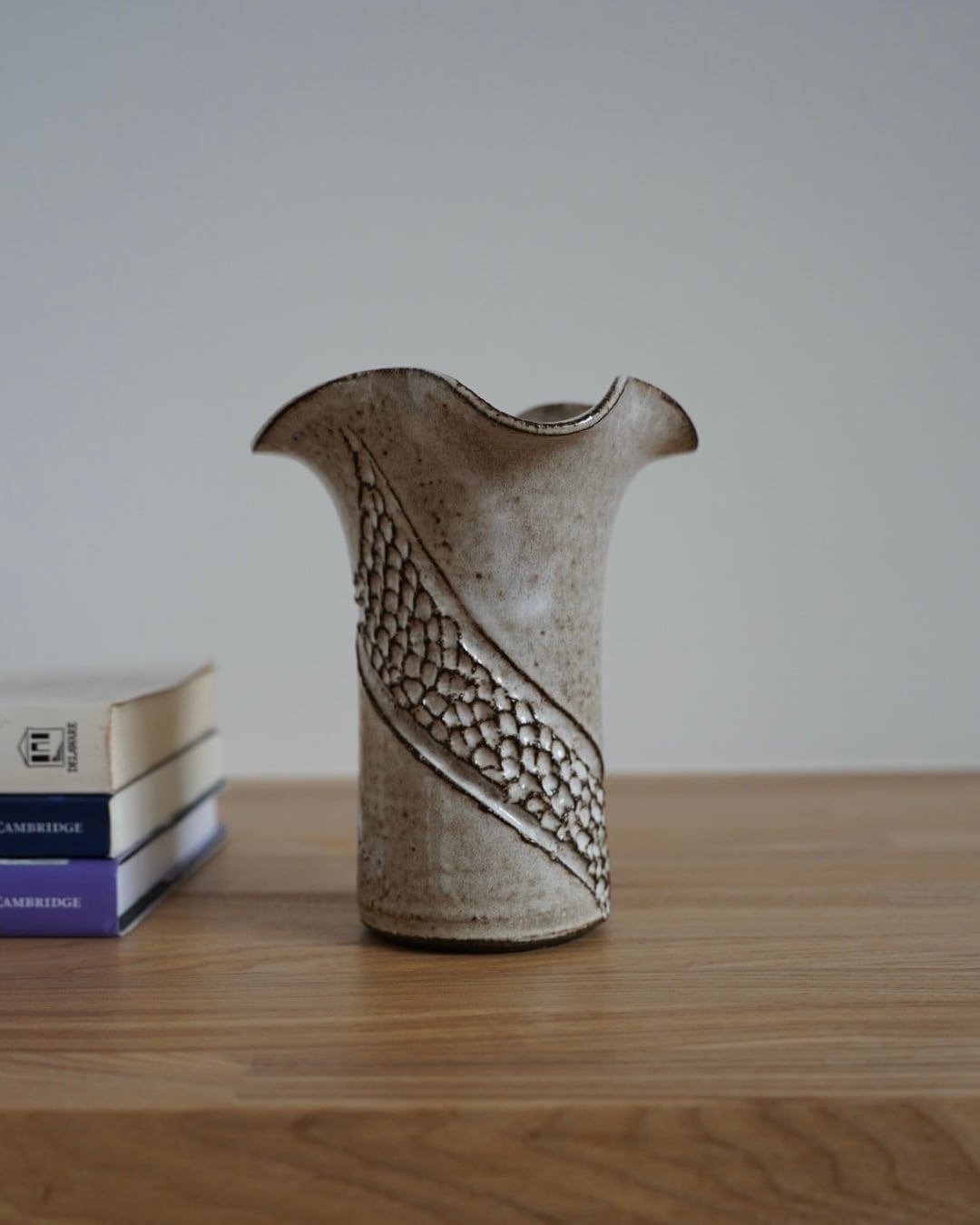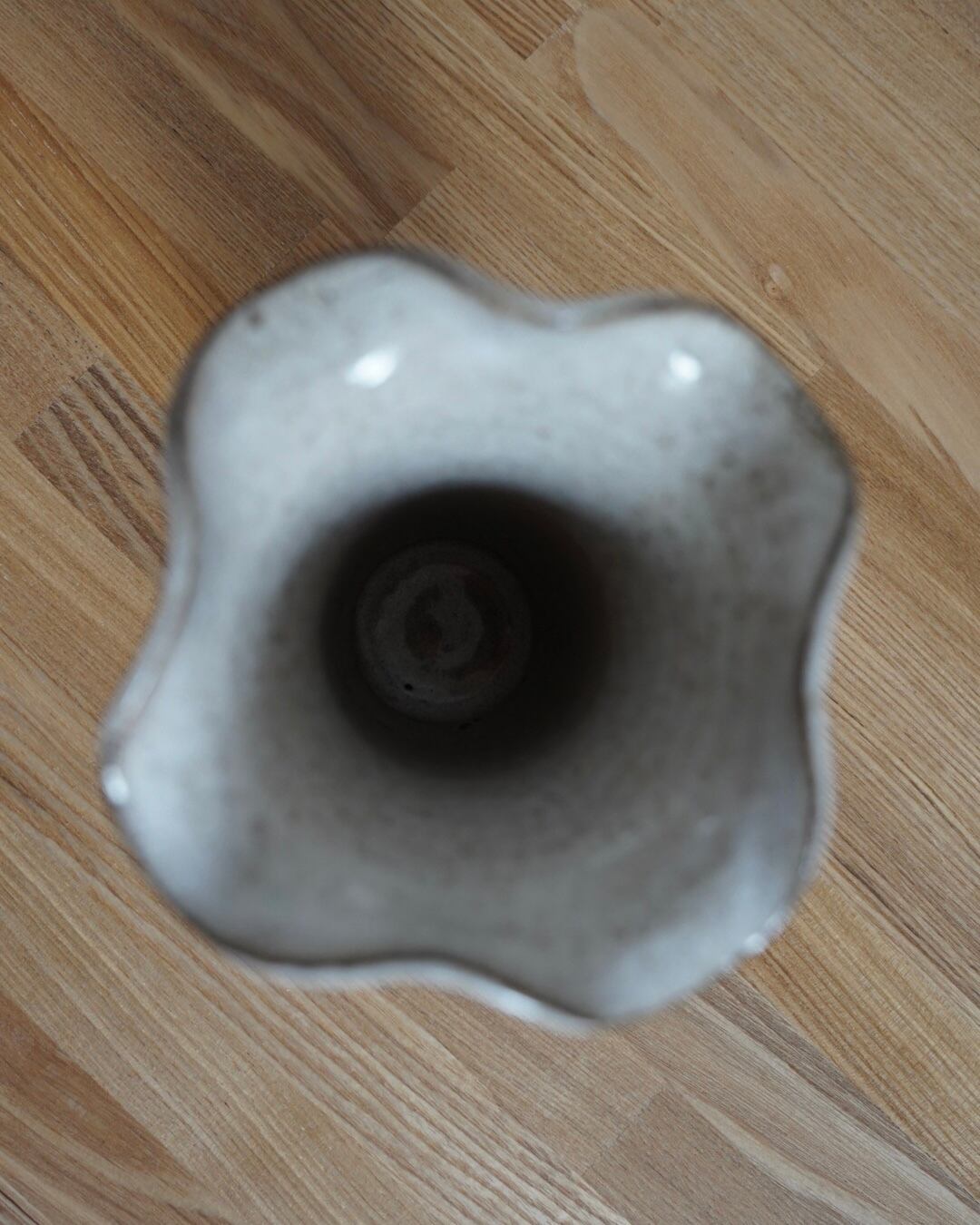 口縁の波型フレアの形状、グレージュのようなニュアンスカラーのマットな質感は、戦後ヨーロッパのモダン花器としてよくみられました。同時期ですが、Fat Lavaとはまた一風ちがった、素朴な仕上がりです。