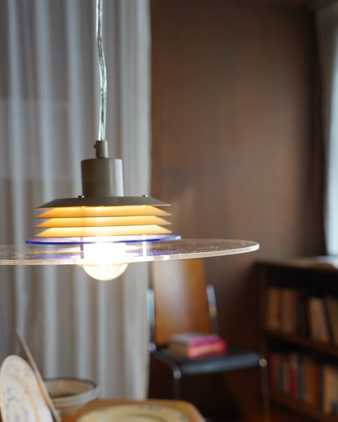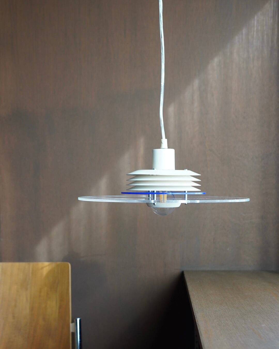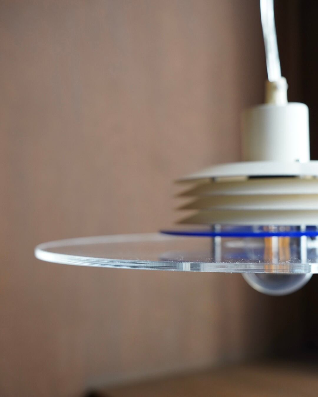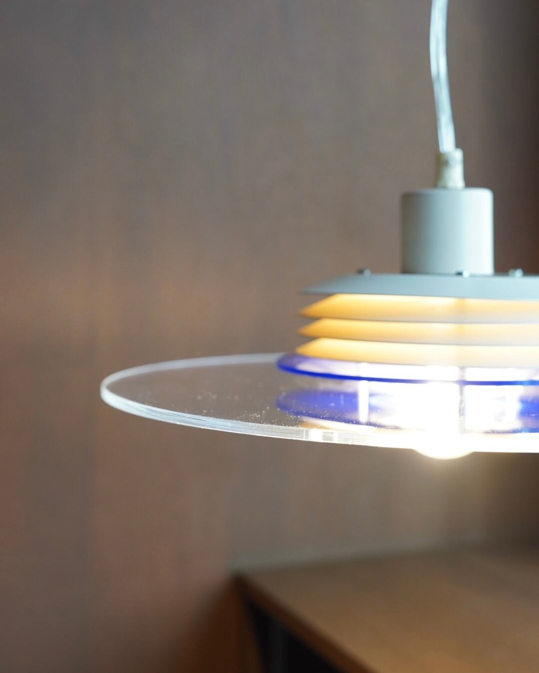 下の半球ディフューザーとアクリルの円盤が特徴で、光源が直接見えないためダイニング照明向きです。