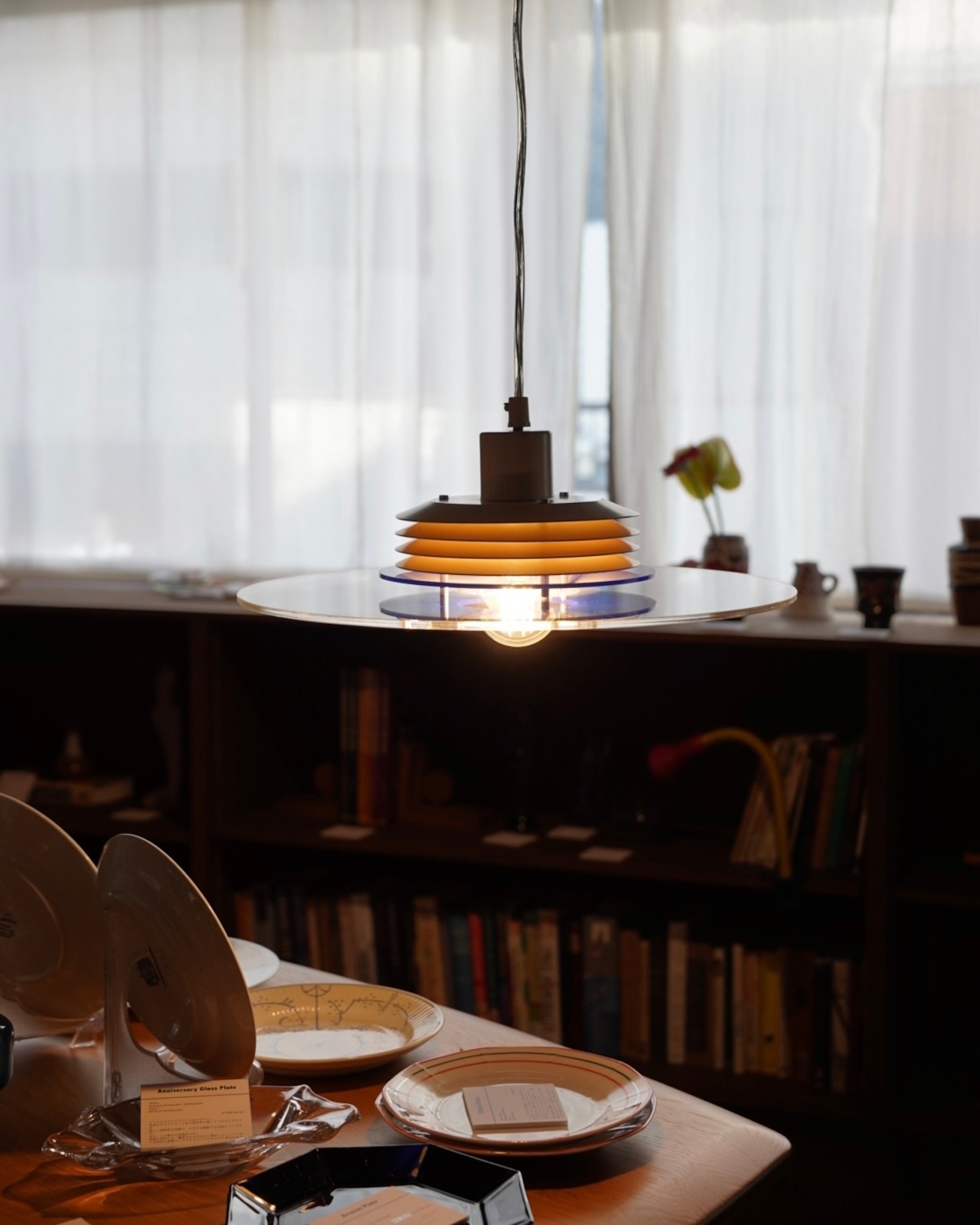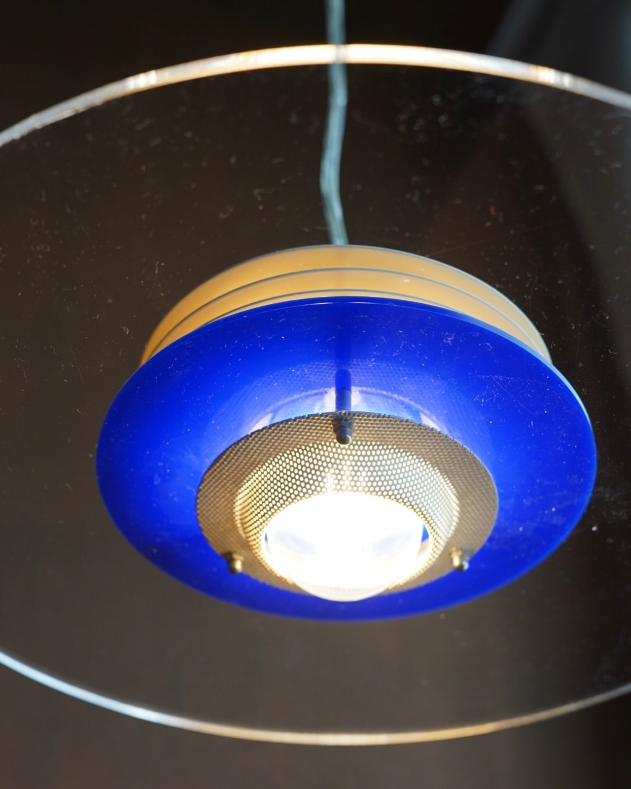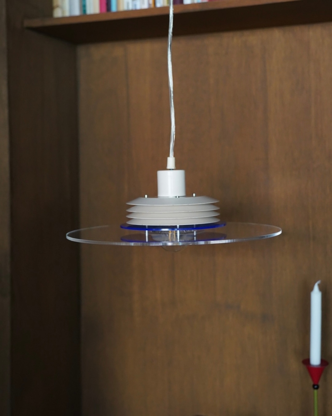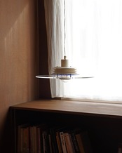 下の半球ディフューザーとアクリルの円盤が特徴で、光源が直接見えないためダイニング照明向きです。