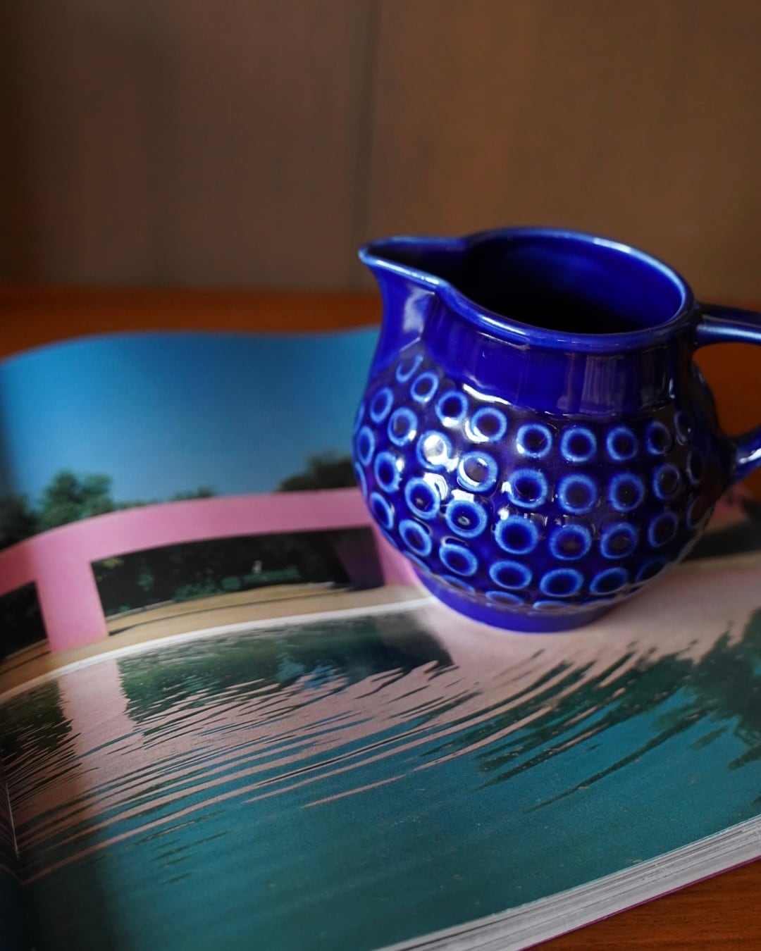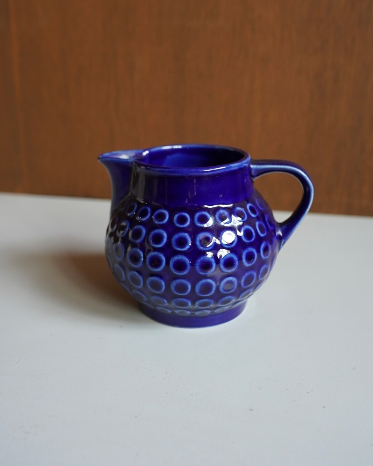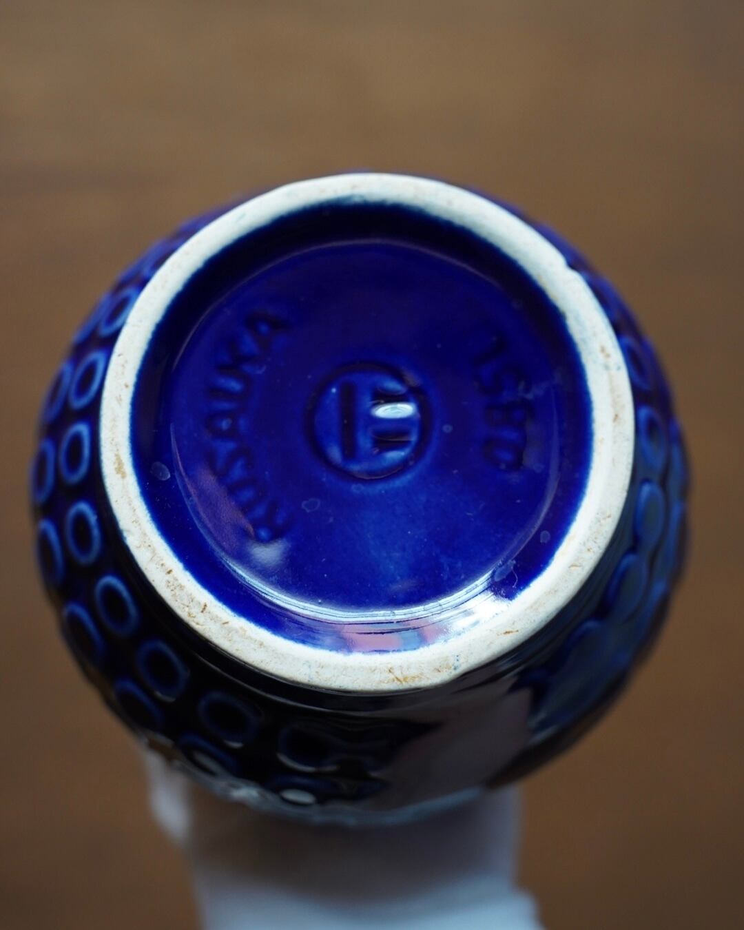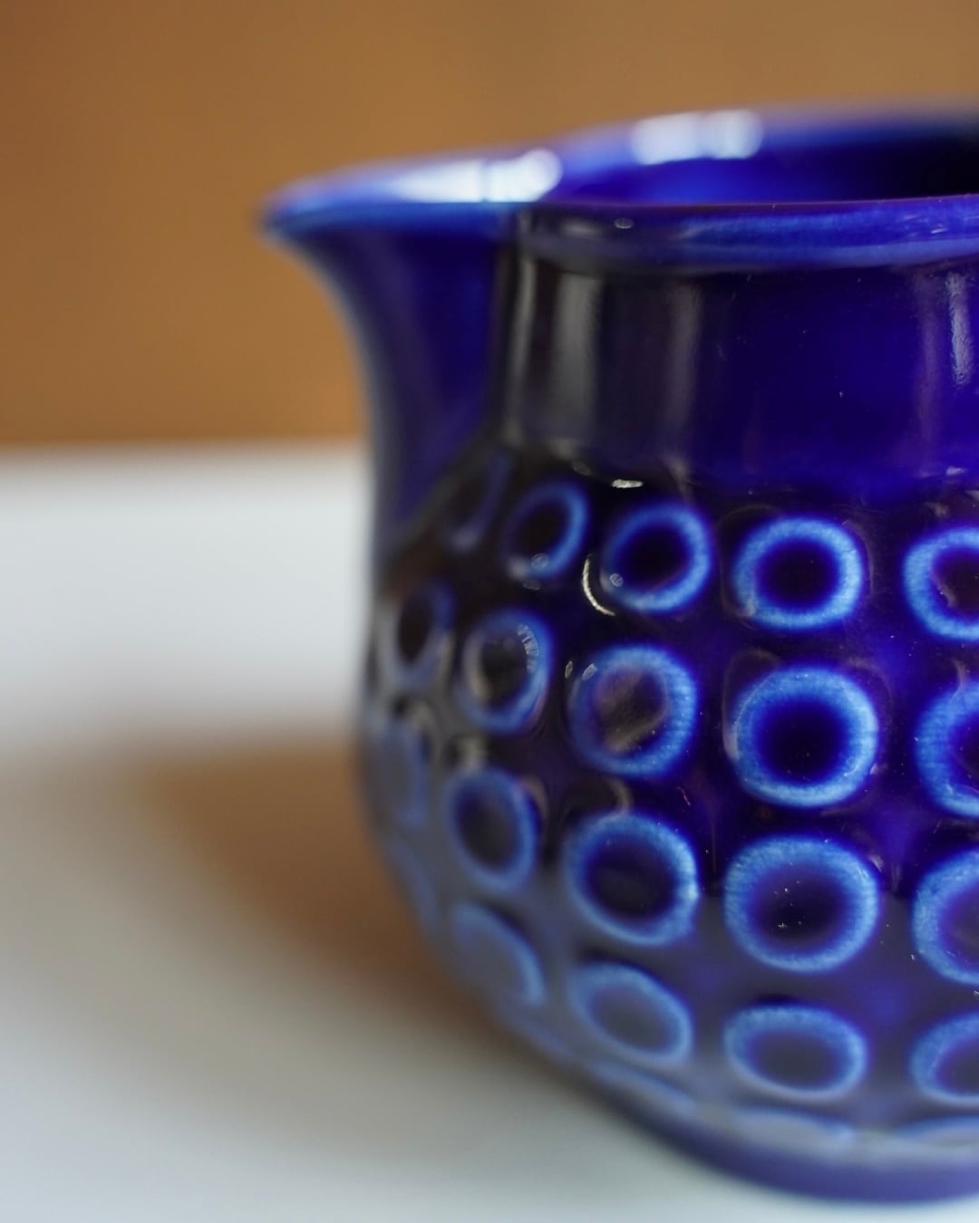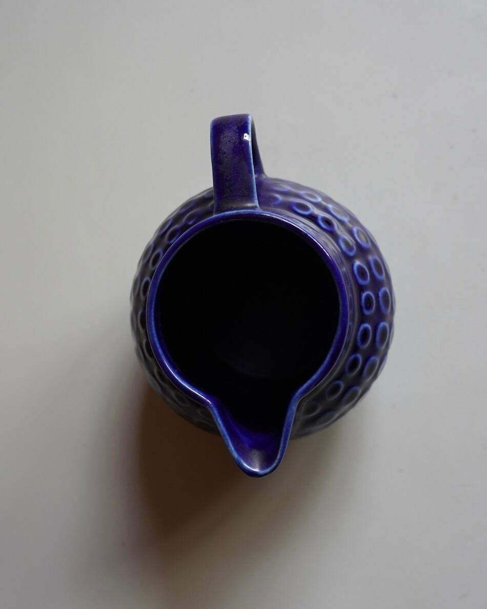 深いコバルトブルーの釉薬に、小さな渦のような円が交差するデザインが施された水差し。